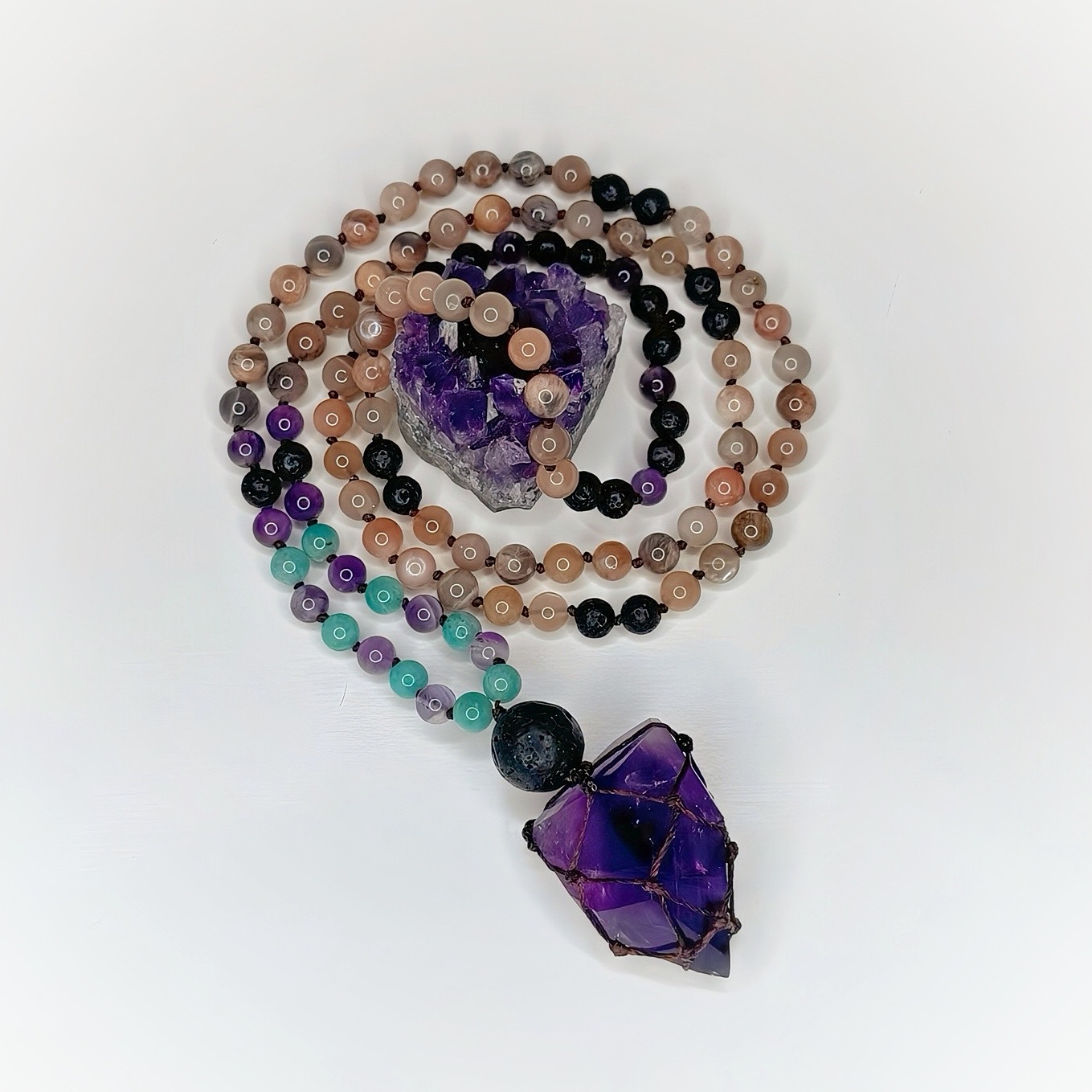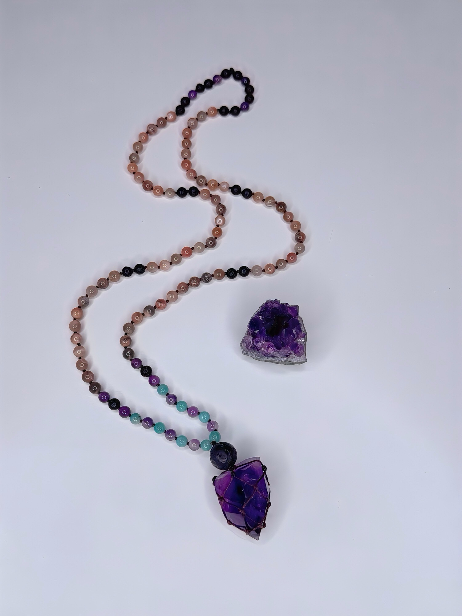 Kette: Schwarzer Mondstein, Amethyst, Amazonit, Lava